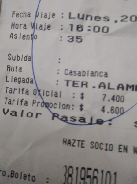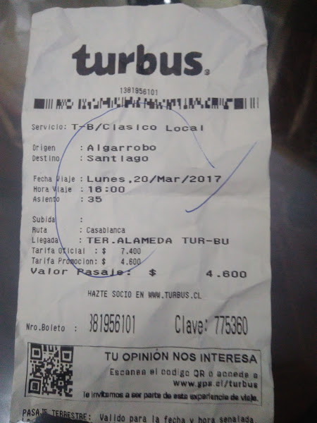 Pues bien, al revisar mi boleto de Turbus veo lo mismo que me pasó cuando vi lo del Metro. Para la empresa el valor del pasaje a Algarrobo que denomina como tarifa oficial vale $7400 mientras la Tarifa Promoción vale $4600.